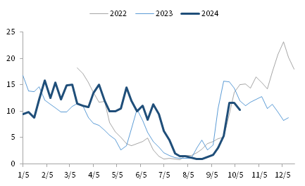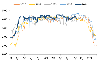 今年东北地区的备肥一直不温不火,一方面前期东北贸易商提前预售了较多高价空单,随着尿素重心下行,这些空单迅速回补,下游部分需求得到满足,另一方面,东北复合肥企业订单不佳,拿货相对谨慎,以上因素共同导致了当前东北备肥进度偏滞后。自8月初至今,东北地区到货量仅有49.5万吨,低于2023年的84.21万吨和2022年的64.12万吨。而根据季节性规律,四季度东北地区备货高峰期阶段,到货量将保持在年内较高水平,甚至持续攀升,后市将有效分流陕、蒙及山西地区的货源。