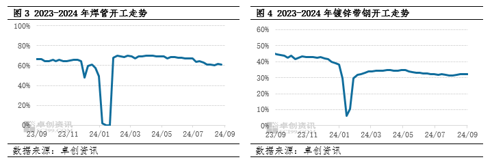 从带钢的主要下游焊管和镀锌带钢来看,三季度国内焊管与镀锌带钢开工率整体呈现震荡偏弱态势,生产企业开工负荷率不高,截至9月底,焊管开工率在60.94%,较7月初下降7.23个百分点,镀锌带钢开工率在31.96%,较7月初下降0.55个百分点。7-8月高温多雨频繁,制约终端项目开工,此外钢市价格表现偏弱,业内对市场信心不足,需求端呈现偏弱态势,对带钢采购意向下降,9月随着国内外一系列政策释放提振,以及终端开工提升,需求端阶段性释放。据卓创初步测算,三季度国内带钢市场月消费量先降后增,总消费量在1535万吨左右,较二季度下降10.23%。
