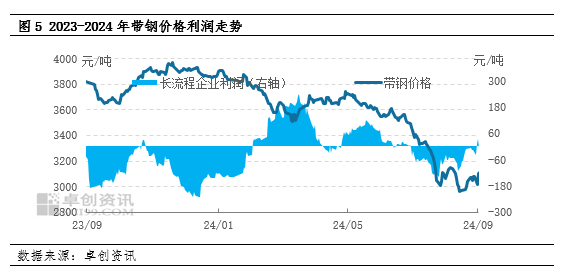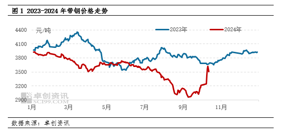 从三季度带钢价格运行具体表现来看,带钢市场从7月初震荡下跌至9月初,主要原因在于,一方面,黑色系期货震荡下跌,业内整体心态偏空,同时上游钢坯不断下跌,钢厂随行就市跟跌为主,市场交投重心下挫;另一方面,7-8月为传统钢市淡季,高温多雨天气制约下游开工,加上钢材价格弱势,下游操作心态谨慎,对带钢采购意向偏弱,加剧市场价格下跌,在此期间唐山带钢市场价格一度跌破3000元/吨,在9月初下探至2960元/吨左右的年内低点。但9月中下旬以来,随着美联储超预期降息提振大宗商品市场,宏观情绪偏暖,期货经过回调后强势上涨,钢厂新单报盘积极跟涨,特别是月底期间国内一系列重磅政策宣布,市场信心受到提振,带钢在月底最后一周累涨500元/吨左右,基本收复前两月跌势。
