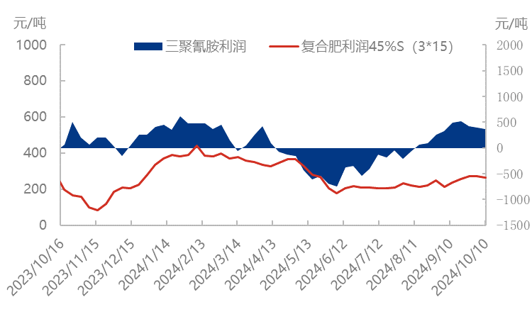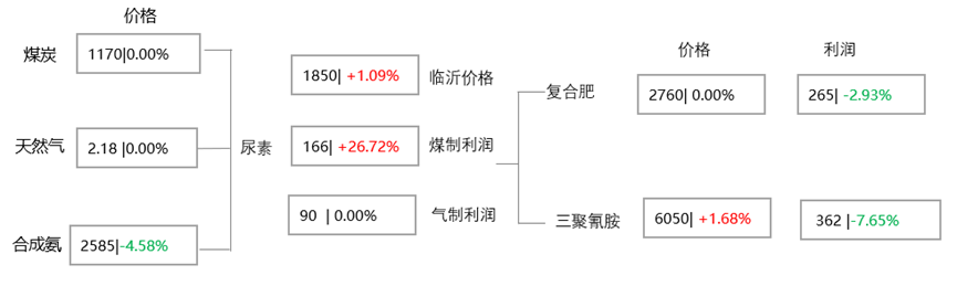 本周期产业链利润涨跌不一;尿素价格走高,利润小幅提升。下游复合肥、三聚氰胺利润均有下降。