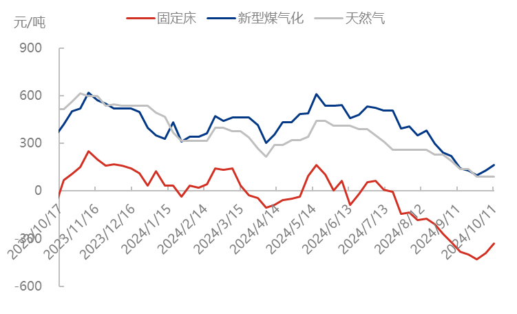 截止2024年10月10日(第41周),中国尿素样本企业理论利润窄幅回升。煤制固定床工艺理论利润为-331元/吨,较上周上调60元/吨。煤制新型水煤浆工艺理论利润为166元/吨,较上周上调35元/吨。气制工艺理论利润90元/吨,较上周持平。主要原因:本周煤炭成本窄幅上行,且尿素价格较上周也有所上涨,利润走高,而气头成本及价格基本保持稳定,企业利润也随之平稳。