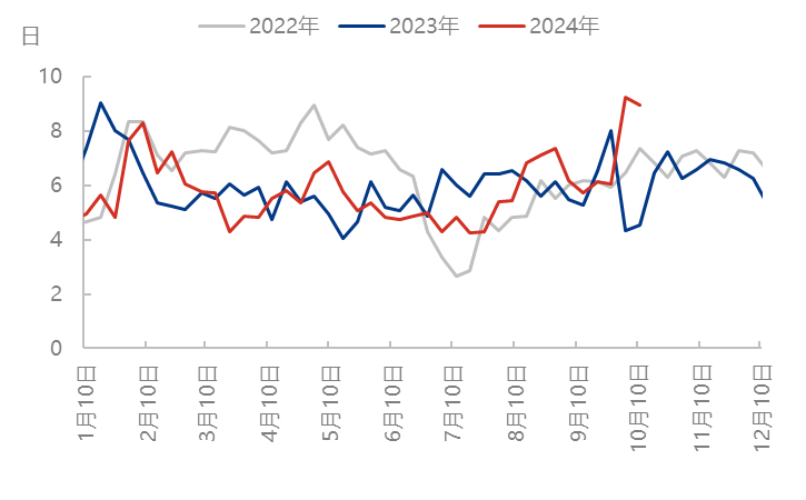截至2024年10月9日,中国尿素企业预收订单天数8.94日,较上周减少0.3日,环比减少3.25%。节中尿素局部走货量增加,尿素一部分兑现前期订单,一部分继续预收新单,但随着节后期货价格的走跌,工厂新单预冷,预收放缓,企业收单差异明显,整体主流订单天数小幅下降。