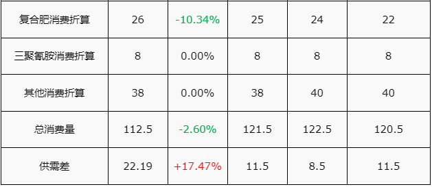 总消费量=农业消费折算+复合肥消费折算+三聚氰胺消费折算+其他消费量(板材、车用、板材、其它化工等)+出口量;数据基本为估算值,仅供参考;