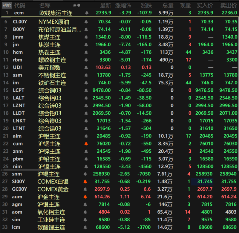 碳酸锂主连跌5.12%,工业硅主连跌0.88%。欧线集运主连跌3.79%。