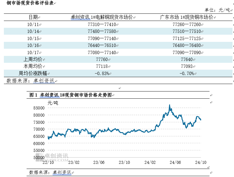 本周四卓创资讯现货铜价在77110元/吨,较上期下跌175元/吨,跌幅为0.23%,周均价为77118元/吨,较上期环比跌幅0.83%。