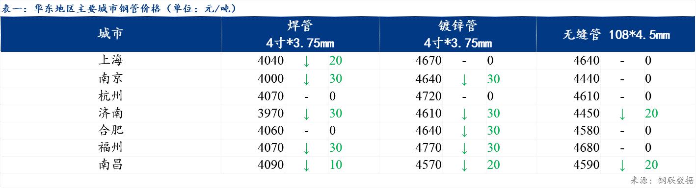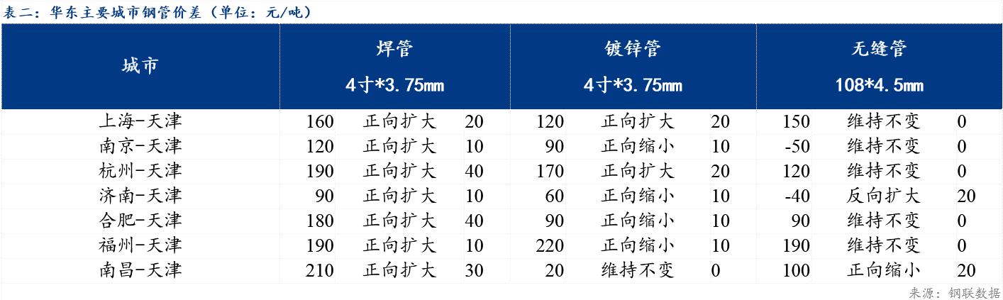今日,华东地区主要城市钢管价差调整10-30元/吨。