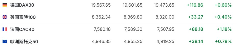 2. 截至发稿,德国DAX指数涨0.60%,英国富时100指数涨0.40%,法国CAC40指数涨1.18%,欧洲斯托克50指数涨0.78%。
