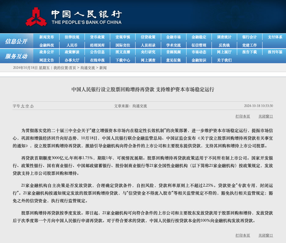 为贯彻落实党的二十届三中全会关于“建立增强资本市场内在稳定性长效机制”的决策部署,进一步维护资本市场稳定运行,提振市场信心,巩固和增强经济回升向好态势,10月18日,中国人民银行联合金融监管总局、中国证监会发布《关于设立股票回购增持再贷款有关事宜的通知》,设立股票回购增持再贷款,激励引导金融机构向符合条件的上市公司和主要股东提供贷款,支持其回购和增持上市公司股票。