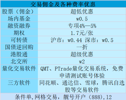 6.99%的固收新客理财福利、L2超级行情,靓号开户、 智能条件单、网格交易、ETF套利(万德宏汇)、日内T0策略工具、提供QMT、Ptrade量化交易系统,极速柜台,VIP快速交易通道、同花顺、雪球、腾讯自选股、通达信、万得、大智慧等软件登录。
