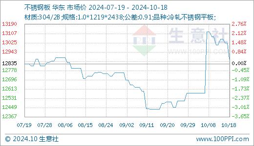 据生意社价格监测,本周不锈钢价格小幅下跌。截止10月18日,现货304/2B不锈钢平板1.0*1219*2438(公差0.91)的日均价为现报价12878.57元/吨,较周初下跌1.37%,同比下跌6.09%。