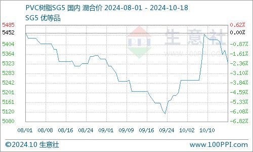 据生意社商品行情分析系统监测显示,本周(10.14-18)PVC现货市场并没有延续节后牛市,价格出现止涨,并出现不同程度下挫。截止周五,国内PVC电石法SG-5型均价5326元/吨,周内价格下跌1.84%。