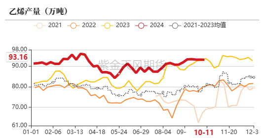 产量:10/1-10/11,国内乙烯产量环比减少。