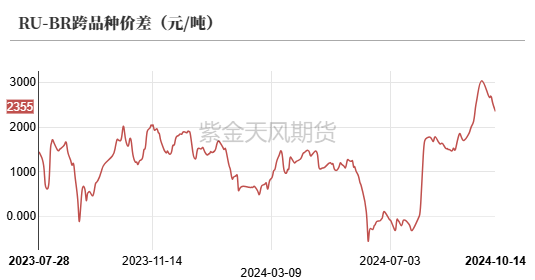 截至10月15日,RU-BR主力合约价差为2355元/吨,周度变化-250元/吨。