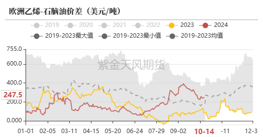 欧洲市场:10/1-10/15,欧洲乙烯市场价格上涨,石脑油市场价格上涨,乙烯-石脑油价差走弱。