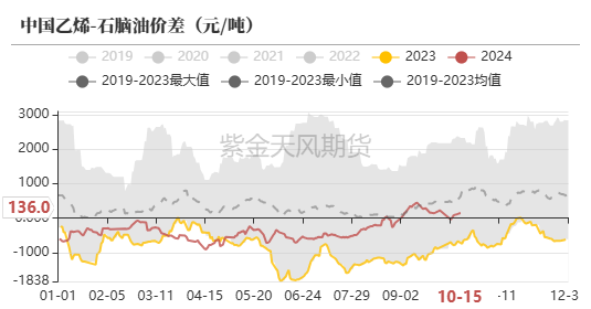 中国市场:10/1-10/15,中国乙烯市场价格不变,石脑油市场价格上涨,乙烯-石脑油价差走弱。