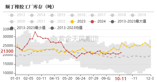 社会库存:10/1-10/11,顺丁橡胶工厂库存累库,近期库存在均值水平附近,约为2.1万吨。