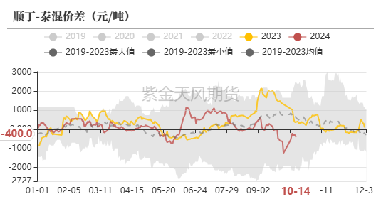 截至10月15日,顺丁-泰混价差为-400元/吨,周度变化150元/吨。