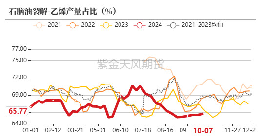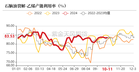 产能利用率:10/1-10/11,国内石脑油裂解产乙烯的产能利用率环比提高。