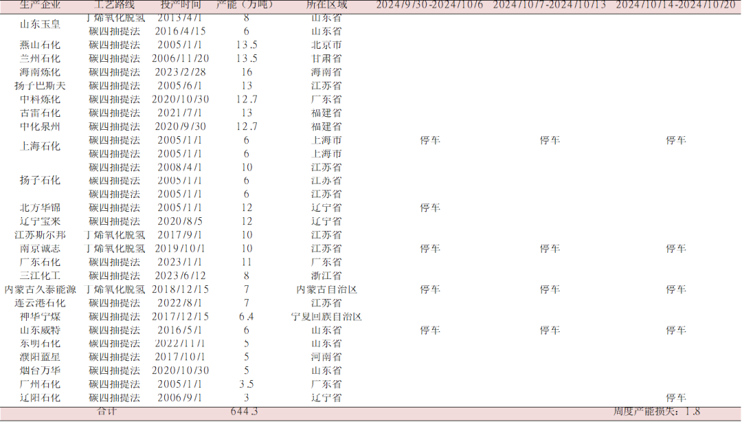 周度产能损失:10/14-10/20,国内丁二烯生产装置由于停车、降负等原因,预计损失产量1.8万吨。
