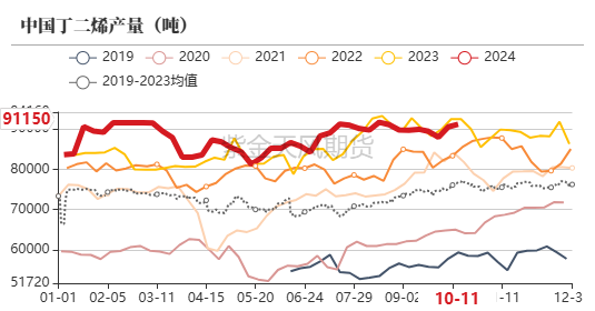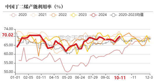 产能利用率:10/1-10/11,丁二烯平均产能利用率为70.02%,环比有所增加,较去年同期有所下降。