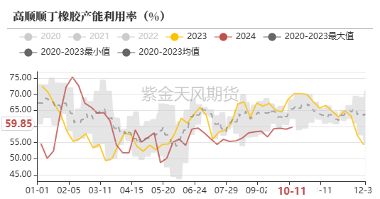产能利用率:10/1-10/11,国内高顺顺丁橡胶的产能利用率环比增加。