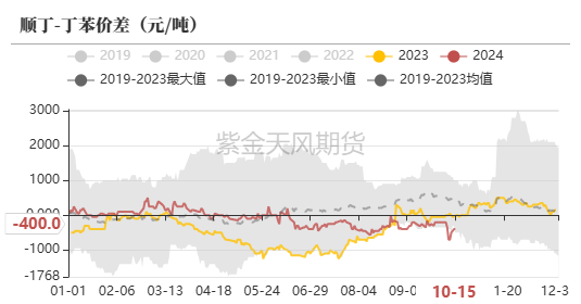 截至10月15日,顺丁-丁苯价差为-400元/吨,周度变化-200元/吨。