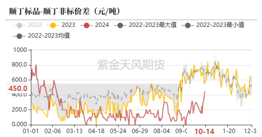 标品-非标价差:中性截至10月14日,顺丁标品-非标价差为450元/吨,周度变化300元/吨。