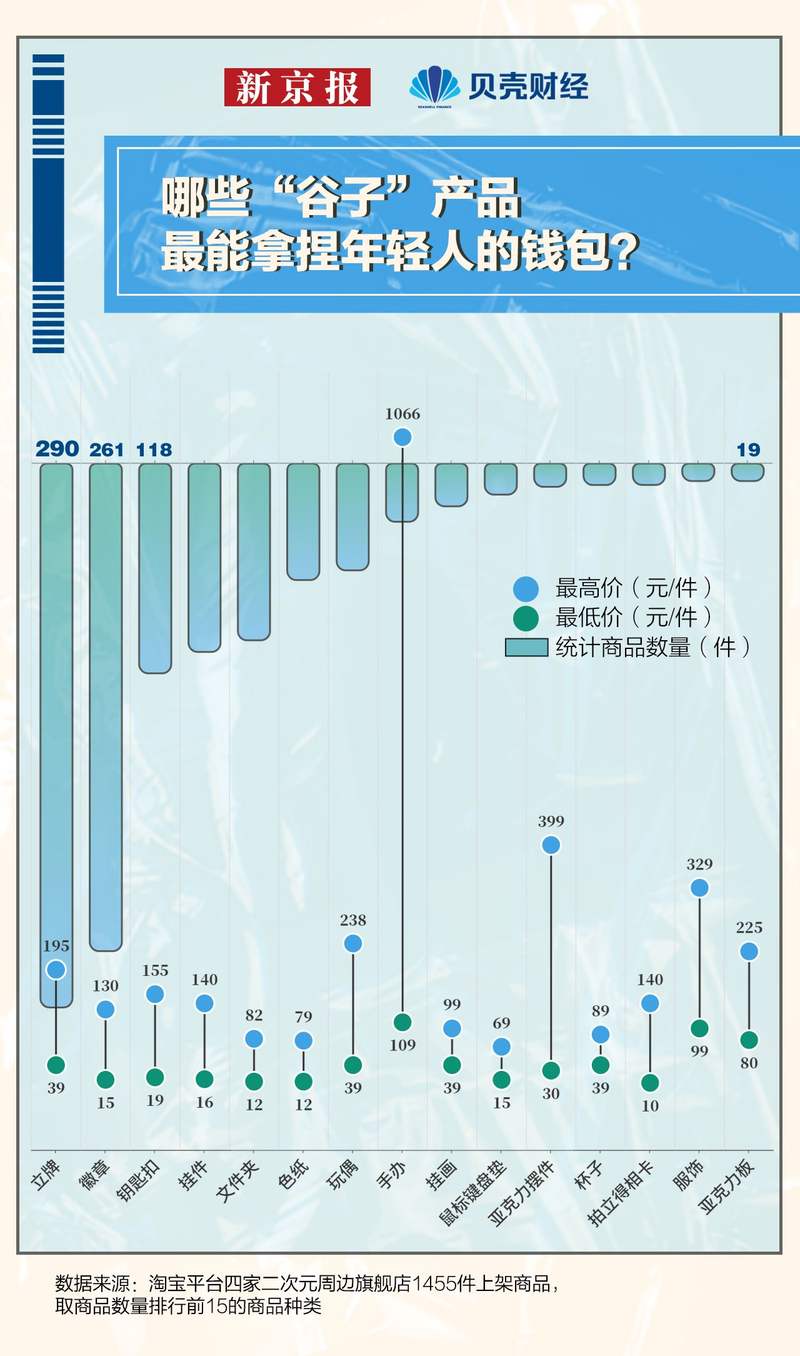 新京报贝壳财经记者统计国内几家主流“谷子店”产品价格发现,15种类型周边产品起步价格在10元,均价超过25元。由于IP以及款式的不同,“谷子”价格也呈现出差异化。以立牌为例,今年国内较火的《蓝色监狱》《排球少年》最高价格均为195元,平均价格为105元。