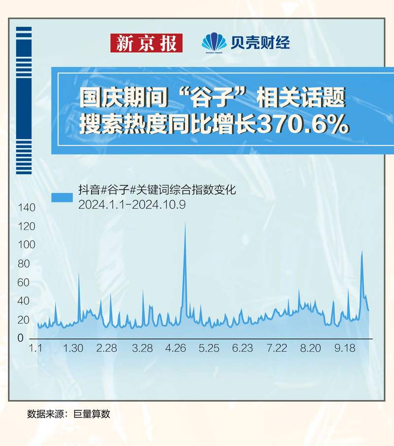 今年,“二次元谷子”热度再次升温。巨量算数数据显示,今年以“谷子”为关键词搜索热度同比增长39.04%。国庆假期期间,“谷子”相关话题再次迎来一波搜索热潮,搜索指数同比增长370.55%,环比增长169.85%。