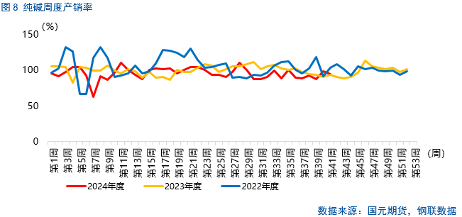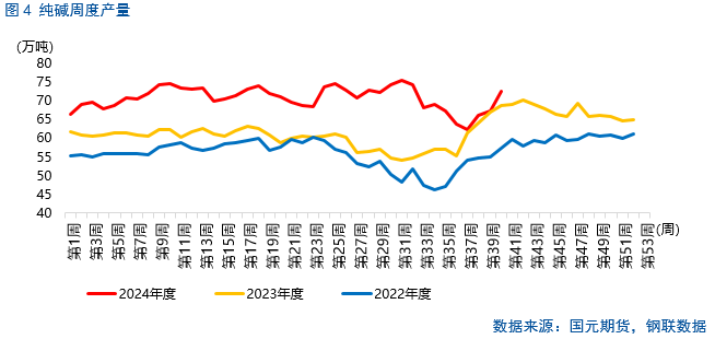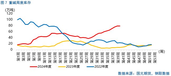 供应:在短期产业链利好之下,本周纯碱产量略有上升,后市来看,江苏有设备计划检修,短期内整体产能利用率变动不大。截至2024年10月10日,本周纯碱综合产能利用率87.84%,上周87.06%,环比增加0.78个百分点;纯碱产量73.23万吨,环比增加0.65万吨,涨幅0.90%。轻质碱产量30.32万吨,环比增加0.41万吨。重质碱产量42.91万吨,环比增加0.24万吨。
