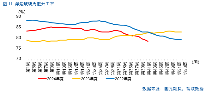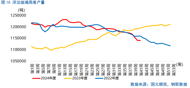 浮法玻璃供应:供应方面,由于前期产业链有试探性回暖,玻璃减产进度偏慢。截至2024年10月10日,浮法玻璃行业平均周产能利用率80.87%,环比减少0.06%。浮法玻璃产量略有上升,主要是国庆前和国庆期间销售好转,价格上提。全国浮法玻璃日产量为16.28万吨,比3日增加0.43%;全国浮法玻璃产量114.01万吨,环比减少0.07%,同比减少4.67%。