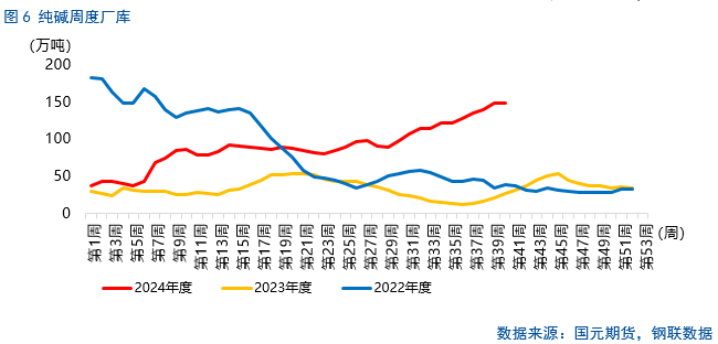 需求及库存:纯碱销售力度放缓,产销率下滑,库存转涨。截至年10月10日,中国纯碱企业出货量69.52万吨,环比下跌2.94%,国内纯碱产销率为94.93%,环比减少3.76个百分点。国内纯碱厂家总库存152.86万吨,较9月30日增加3.71万吨,涨幅2.49%。其中,轻质纯碱70.38万吨,环比增加0.31万吨,重质纯碱82.48万吨,环比增加3.40万吨。
