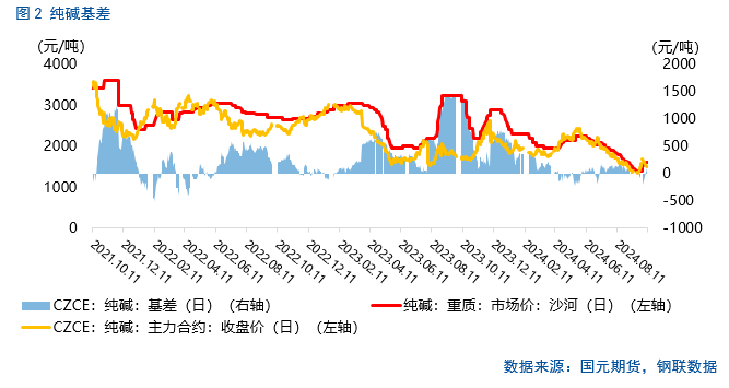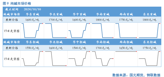 国庆假期后,纯碱2501合约三连跌,周四日内收于1472,截至10月10日,华北纯碱基差在228元/吨;华东纯碱基差在128元/吨。