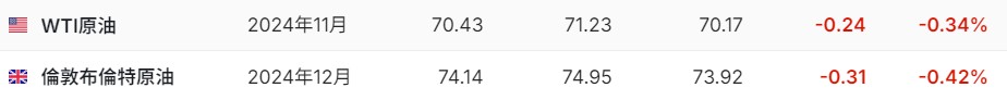 3. 截至发稿,WTI原油跌0.34%,报70.43美元/桶。布伦特原油跌0.42%,报74.14美元/桶。