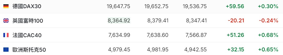 2. 截至发稿,德国DAX指数涨0.30%,英国富时100指数跌0.24%,法国CAC40指数涨0.68%,欧洲斯托克50指数涨0.65%。