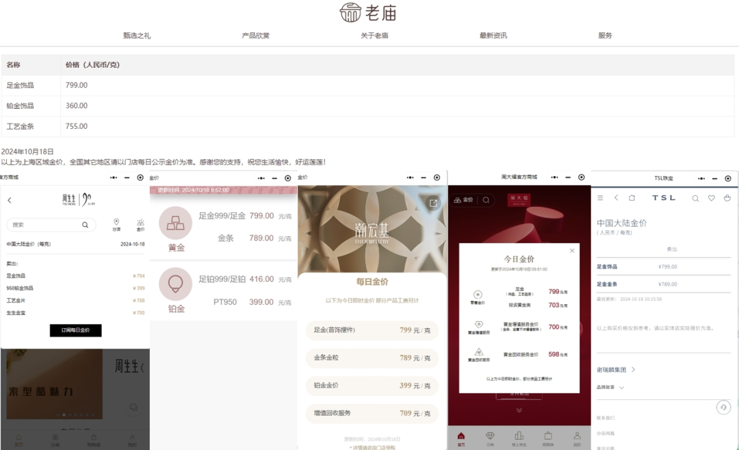 多家黄金珠宝品牌10月18日公布的零售金价截图