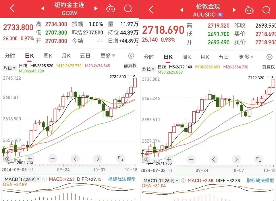 截至10月18日22时40分,伦敦现货黄金价格盘中一度达2719.32美元/盎司,COMEX黄金期货价格一度达2734.3美元/盎司。