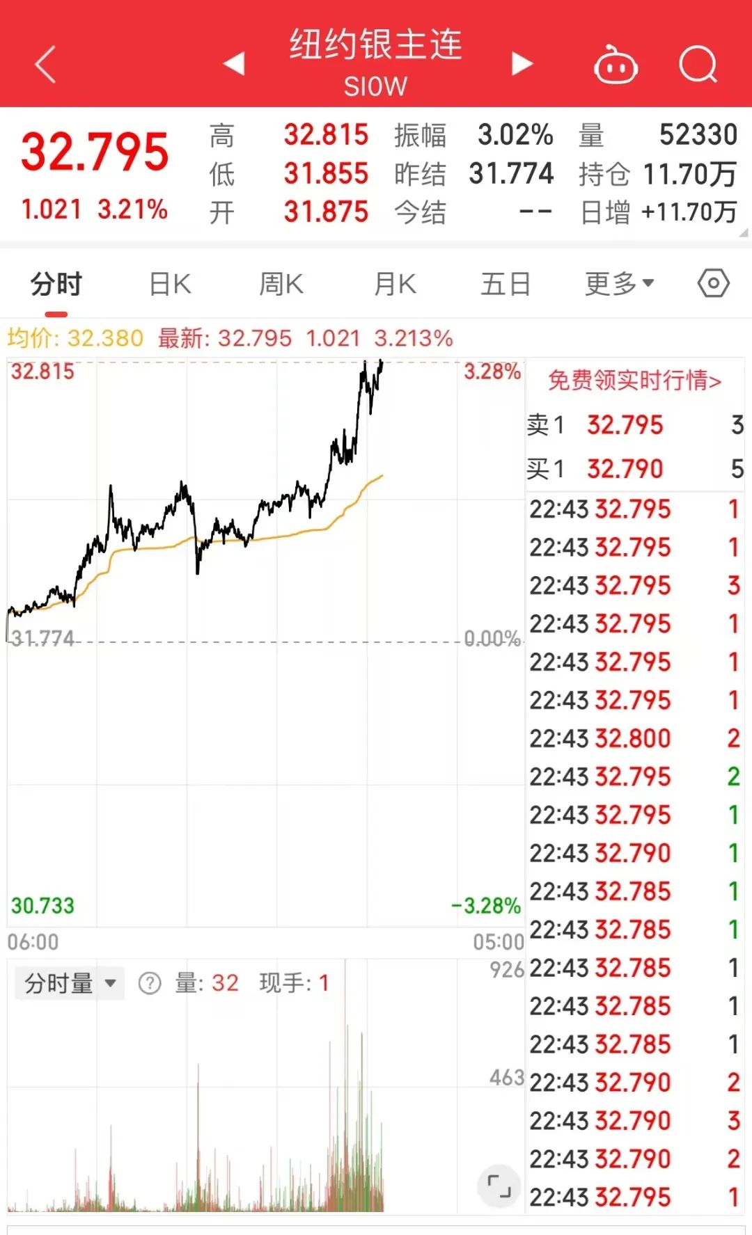 纽约银主连直线拉升,截至发稿涨超3%,报32.795美元/盎司。