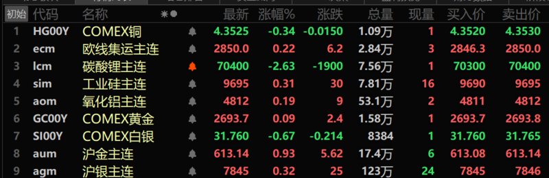 截至午间收盘,内盘金属普跌,沪铅跌0.39%,沪锡跌1%,沪铝、沪铜微涨。沪镍跌1.44%,沪锌跌0.74%。氧化铝主连涨0.19%。此外,碳酸锂主力跌2.63%,工业硅涨0.31%。