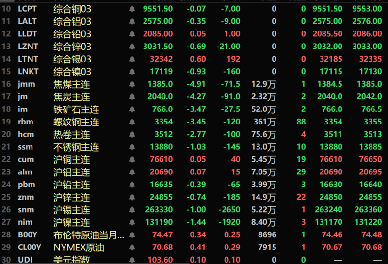 黑色系均飘绿,铁矿跌3.47%,螺纹、热卷分别跌3.45%、2.77%。不锈钢跌1.03%。双焦方面,焦煤跌4.91%,焦炭跌4.27%。