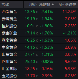 不过,在金价上涨的背景下,10月17日A股黄金板块并未出现整体上涨。数据显示,截至当日收盘,黄金板块整体下跌1.51%。板块当中,跌幅最大的西部黄金下跌2.41%,赤峰黄金、恒邦股份、紫金矿业等多股跌逾1%;*ST中润上涨5%,玉龙股份、山金国际分别上涨2.39%、0.16%。