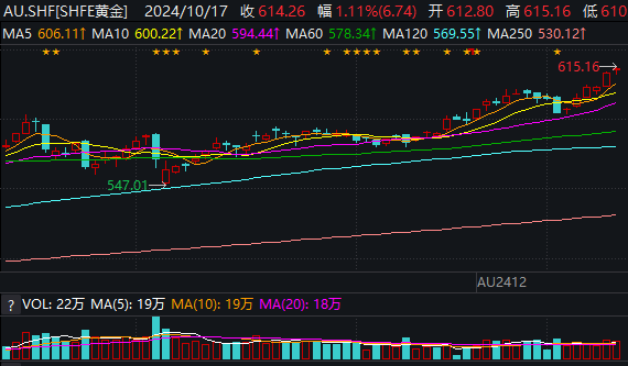 国内来看,数据显示,截至17日收盘,上期所黄金期货主力合约上涨1.11%,报614.26元/克,盘中一度创下615.16元/克的历史新高,今年以来累计涨幅达25.81%;上金所AU9999黄金价格则收涨0.44%,报612.66元/克,盘中同样刷新613.5元/克的历史新高,今年以来累计涨幅达26.67%。