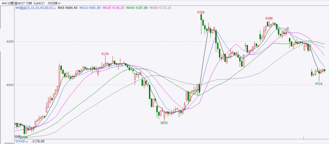隔夜国际原油价格大幅下跌,对燃料油成本支撑减弱。高低硫燃料油价格再次跟随原油走势日盘下行,其中低硫燃料油2412合约盘中最大跌幅超4%,收在4064元/吨,跌幅3.47%。