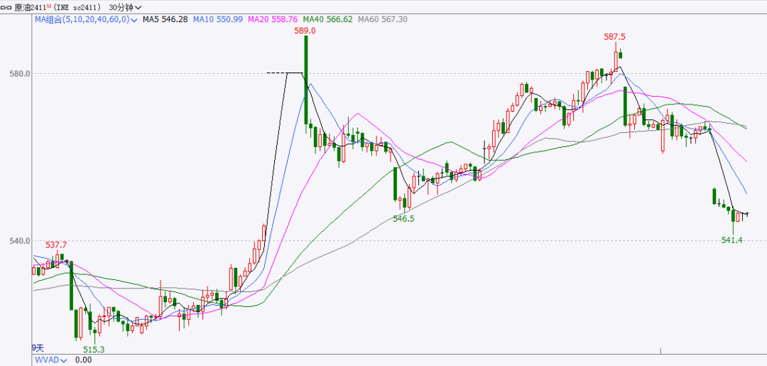 由于中东局势缓和,隔夜国际油价大幅下跌。开盘后,国内原油期货价格随之迅速下跌,截止收盘,原油下跌4.97%,报价546.5元/桶。