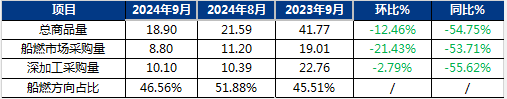 内贸船燃方面,9月内贸船燃样本企业批发出库量为28.99万吨,环比跌23.91%,同比跌30.78%。9月内贸船燃市场呈现“旺季不旺”行情,多数时期船燃议价处于震荡走跌趋势,中下游普遍看空后市,建库意愿极低,叠加九月航运市场拉运需求未见起色,船东亦维持刚需补油。多重利空下内贸船用重油需求下滑,混兑贸易商签单量缩减,对低硫渣油的采购需求下滑。9月份船燃方向采购低硫渣油数量为8.80万吨,船燃方向在低硫渣油的货源流向占比为46.56%,较8月份占比走跌。