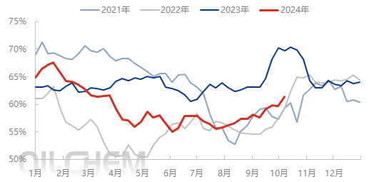 (2)供应端:裕龙石化继续开工提量,山东炼厂常减压产能利用率上涨。截止10月10日,中国成品油独立炼厂常减压产能利用率为61.33%,环比上周上涨1.66个百分点。东北、山东等地区部分炼厂重新开工,独立炼厂产能利用率走高。同时北方燃料油外销主力炼厂即将恢复生产,预期供应继续增加。