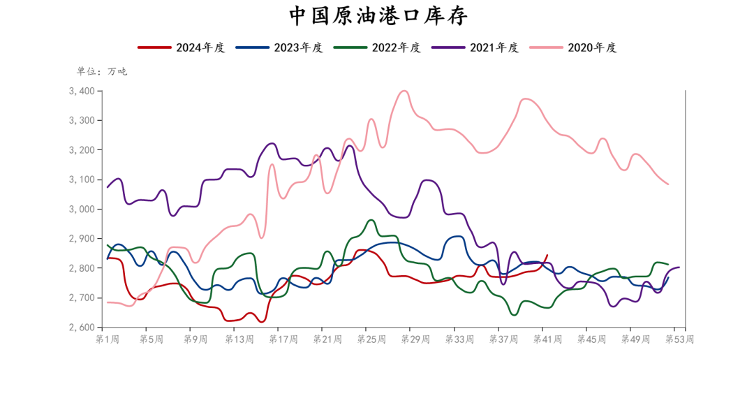 中国港口原油库存不断上涨,库存水平较上周增加53.4万吨,环比增长1.91%,库存水平为近四年同期高位。