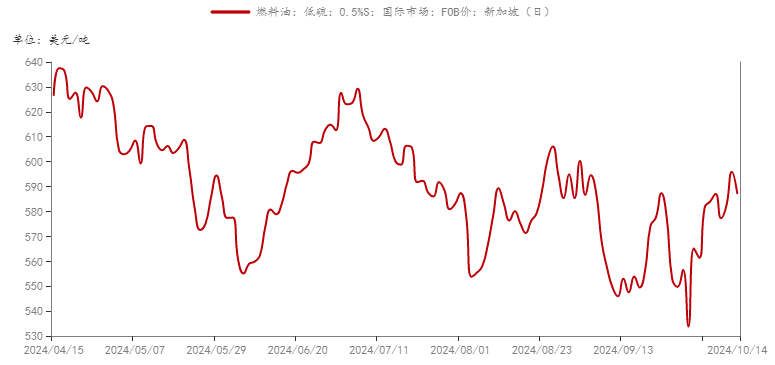 (4)国际市场端:新加坡燃料油现货市场价格下调。10月14日新加坡燃料油现货市场价格下调,其中0.5%低硫燃料油现货价格下跌8.72美元/吨,为587.13美元/吨。