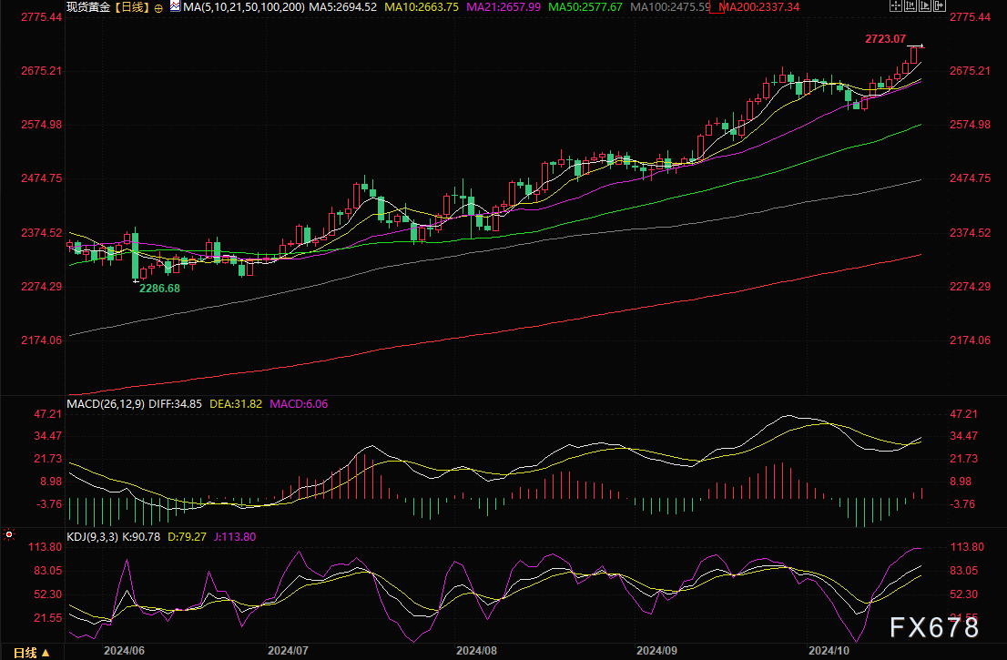 汇通财经APP讯——周一(10月21日)亚市早盘,现货黄金小幅冲高,最高触及2723.07美元/盎司,再度刷新历史高点。金价上周五升穿每盎司2700美元大关,收报2722.13美元/盎司,为史上首次,受助于中东紧张局势升级、美国大选的不确定性以及宽松货币政策预期,金价上周累计上涨2.45%。