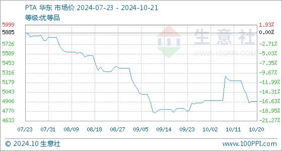 10月21日,生意社PTA基准价为4912.00元/吨,与本月初(4928.00元/吨)相比,下降了-0.32%。